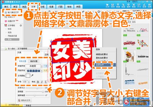 3.接著進(jìn)入“文字”菜單下,選擇輸入靜態(tài)文字,點(diǎn)擊網(wǎng)絡(luò)字體,選擇文鼎霹靂體,顏色-白色,調(diào)節(jié)每個(gè)文字的顏色、方向、大小、字與字之間的間距等參數(shù),最后鼠標(biāo)右鍵“全部合并”,第一個(gè)網(wǎng)絡(luò)圖章就做好了。