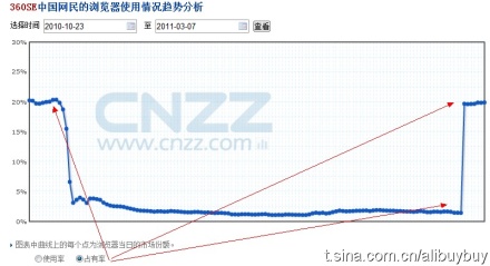自從3Q大戰(zhàn)以來,360瀏覽器就一直使用IE的識別標志,使得外界無法獲知360瀏覽器的實際份額。CNZZ自3月開始對360瀏覽器進行了重新統計,360瀏覽器占有量3月1號后出現異常波動,直線上升(見下圖)。2010年10月31號占有量為20.8%,11月2號后開始直線下跌,到11月5日跌倒3%,而后占有量一路都在在2%以下。突然從3月1號直線上升,幾乎一夜恢復到了去年3Q大戰(zhàn)前的水平。目前360瀏覽器的占有率已經恢復戰(zhàn)前水平,但已經低于IE8,名列第三。