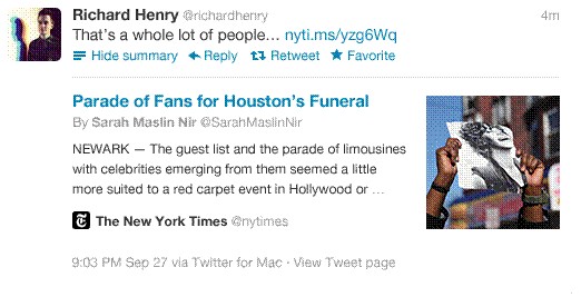 Twitter Cards實(shí)際上是一種為拓展后的、富媒體的Twitter消息提供支持的技術(shù)。在加入一些代碼行以后,出版商、品牌和開(kāi)發(fā)者就能創(chuàng)造出更好的Twitter消息,在Twitter數(shù)據(jù)流內(nèi)部展示其內(nèi)容。舉例來(lái)說(shuō),當(dāng)AllThingsD和《紐約時(shí)報(bào)》等網(wǎng)站通過(guò)Twitter消息來(lái)發(fā)布指向一篇報(bào)道的鏈接時(shí),一張“摘要卡”就能顯示出一個(gè)更加精心設(shè)計(jì)的版本,就像是這樣: