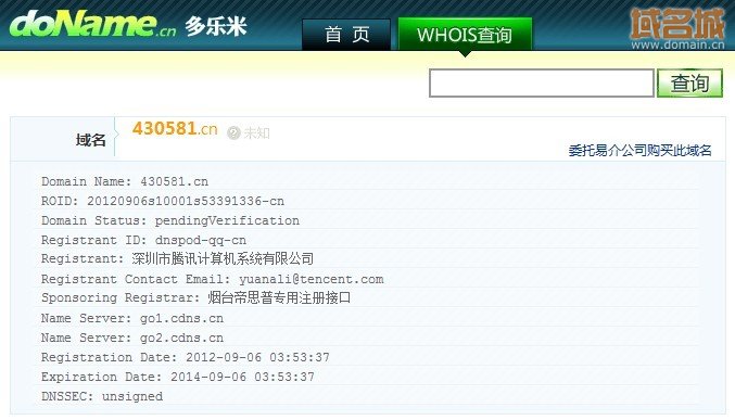 昨晚八點開始,騰訊公司注冊了數萬個五位數字和六位數字.cn域名,意在保護五位數和六位數QQ號域名。目前這些域名正在審核中。筆者發現,騰訊公司從昨天晚上八點開始一直持續到今日凌晨4點左右,將五數字.cn域名從10000.cn開始到99999.cn之間的,六數字.cn域名從100000.cn到430581.cn之間的所有未注冊.cn域名通過一家名為煙臺帝思普專用注冊接口的注冊商全部注冊一空。