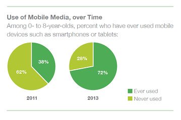 兒童倡導組織Common Sense Media的最新調查發現,兒童對平板電腦、智能手機等帶屏便攜設備的使用率在過去兩年仍呈現爆炸式增長:0-8歲兒童中使用移動設備的人數比例從2011年的38%升至2013年的72%,增長89%。
