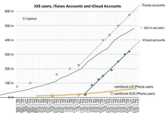 圖表中給出了擁有已激活iTunes賬號的用戶總數(shù),以及擁有iCLoud賬號的用戶總數(shù);此外,地區(qū)性的iPhone數(shù)據(jù)則對iOS設(shè)備的用戶增長提供了某種額外的測試。最終得出的結(jié)果是,iOS活躍用戶總數(shù)“大約為5億人”,每個(gè)月增加1100萬人左右。