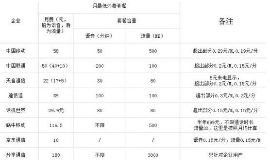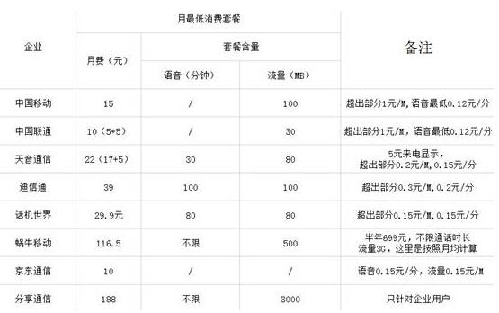 從表格中可以看出,一部分虛擬運營商入門門檻較低,如天音通信、話機世界、京東通信等,月最低消費均在30元以下,這些企業對于消費能力較低的用戶來說,確實是不錯的選擇。