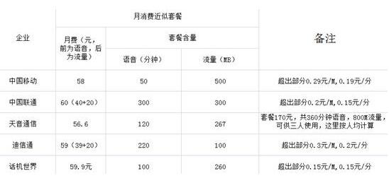 虛擬運營商的資費套餐是否真如其宣傳那樣“美好”。由于各家企業套餐資費并不一致,我們以56-60元的月套餐維度來進行比較。
