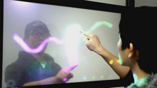 據悉,Transwall由樹脂玻璃制成,內部鑲嵌了紅外線觸摸傳感器,而最內層則是用來顯示圖像的全系膠片。可是Transwall是到底是如何工作的呢?其實,Transwall在感受到壓力之后會將信息傳輸給控制中心,控制中心經過計算向屏幕兩側的兩臺投影儀分別發出命令,將圖像投射至觸控所對應的位置。Transwall可以顯示多種顏色,觸摸交互方式也是多種多樣,可玩性非常高,相信這種雙面觸控技術在未來一定會有相當廣闊的發展前景。