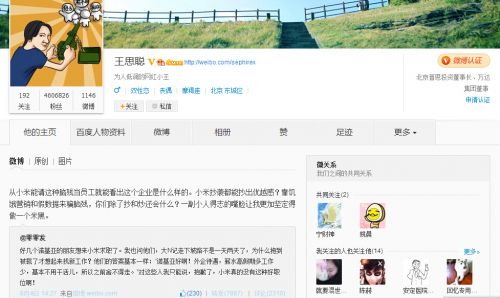 王思聰微博原文:從小米能請這種腦殘當員工就能看出這個企業是什么樣的。小米抄襲都能抄出優越感?靠饑餓營銷和假數據來騙腦殘,你們除了抄和炒還會什么?一副小人得志的嘴臉讓我更加堅定得做一個米黑。