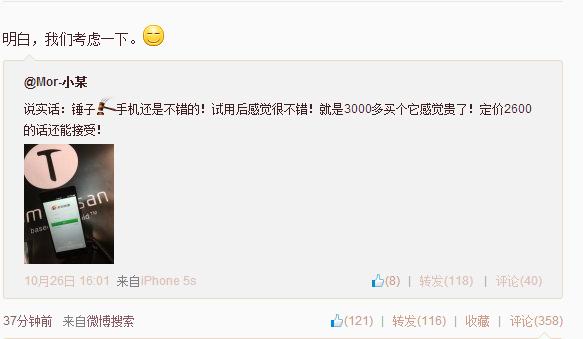 10月27日,羅永浩今日轉(zhuǎn)發(fā)錘子手機用戶的微博,表示考慮對手機進行降價。微博用戶@Mor-小某 昨日發(fā)微博稱:“錘子手機還是不錯的!試用后感覺很不錯!就是3000多買個它感覺貴了!定價2600的話還能接受!”羅永浩今天轉(zhuǎn)發(fā)了其降價的微博,并表示:“明白,我們考慮一下。“這可能是錘子手機降價的信號。