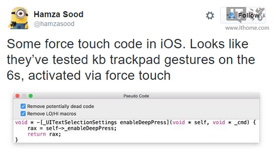 具體來說,Hamza Sood在iOS9中發現了一段代碼,可以讀取屏幕壓力并選取UI文本,然而,該代碼在他使用的iPhone6上被標記為“False”,換句話說,ForceTouch功能將出現在下一代iPhone6s、iPhone6s Plus上。