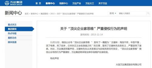 此外,萬達集團已向國家網信辦舉報“頂尖企業家思維”公眾號的侵權行為。