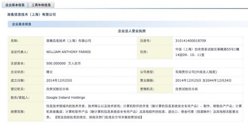 工商資料顯示,澎集信息成立于2014年12月25日,股東為Google Ireland Holdings(谷歌愛爾蘭控股),法人代表是William Anthony Farris,注冊資本為500萬元。該公司的經營范圍包括:信息技術領域內的技術開發、技術轉讓以及技術咨詢;計算機軟件的開發(除計算機信息系統安全專用產品)、制作,銷售自產產品;計算機系統集成;計算機軟件產品(除計算機信息系統安全專用產品)及其他組件的批發、進出口、傭金代理(拍賣除外)及其他相關配套業務。