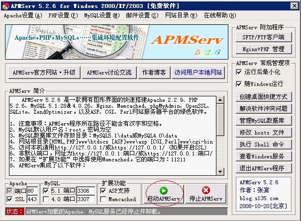APMServ 5.2.6 是一款擁有圖形界面的快速搭建Apache 2.2.9、PHP 5.2.6、MySQL 5.1.28&4.0.26、Nginx 0.7.19、Memcached 1.2.4、phpMyAdmin 2.11.9.2、OpenSSL、SQLite、ZendOptimizer,以及ASP、CGI、Perl網(wǎng)站服務(wù)器平臺(tái)的綠色軟件。無(wú)需安裝,具有靈活的移動(dòng)性,將其拷貝到其它目錄、分區(qū)或別的電腦時(shí),均只需點(diǎn)擊APMServ.exe中的啟動(dòng)按鈕,即可自動(dòng)進(jìn)行相關(guān)設(shè)置,將Apache和MySQL安裝為系統(tǒng)服務(wù)并啟動(dòng)。APMServ集合了Apache穩(wěn)定安全的優(yōu)點(diǎn),并擁有跟IIS一樣便捷的圖形管理界面,同時(shí)支持MySQL 5.0 & 4.0兩個(gè)版本,虛擬主機(jī)、虛擬目錄、端口更改、SMTP、上傳大小限制、自動(dòng)全局變量、SSL證書(shū)制作、緩存性能優(yōu)化等設(shè)置,只需鼠標(biāo)一點(diǎn)即可完成。