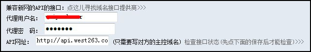 這里要求輸入代理用戶(hù)名、代理密碼以及API網(wǎng)址。代理用戶(hù)名和密碼參見(jiàn)說(shuō)明文檔開(kāi)頭設(shè)置的密碼。API網(wǎng)址填寫(xiě):http://api.west263.com。如圖:
