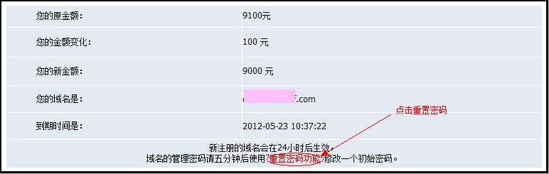 系統(tǒng)會(huì)提示您的域名到期時(shí)間和重置密碼的提示:新注冊(cè)的域名會(huì)在24小時(shí)后生效,域名的管理密碼請(qǐng)五分鐘后使用"重置密碼功能"修改一個(gè)初始密碼。點(diǎn)擊“重置密碼功能”,如圖: