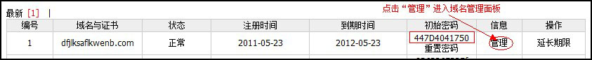 重置密碼后,會(huì)顯示一個(gè)初始密碼,點(diǎn)擊右側(cè)的“管理”就可以登陸域名管理面板了。如圖: