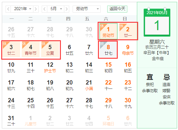 2021年5月1日(星期六)至2021年5月5日(星期三)放假,共5天;